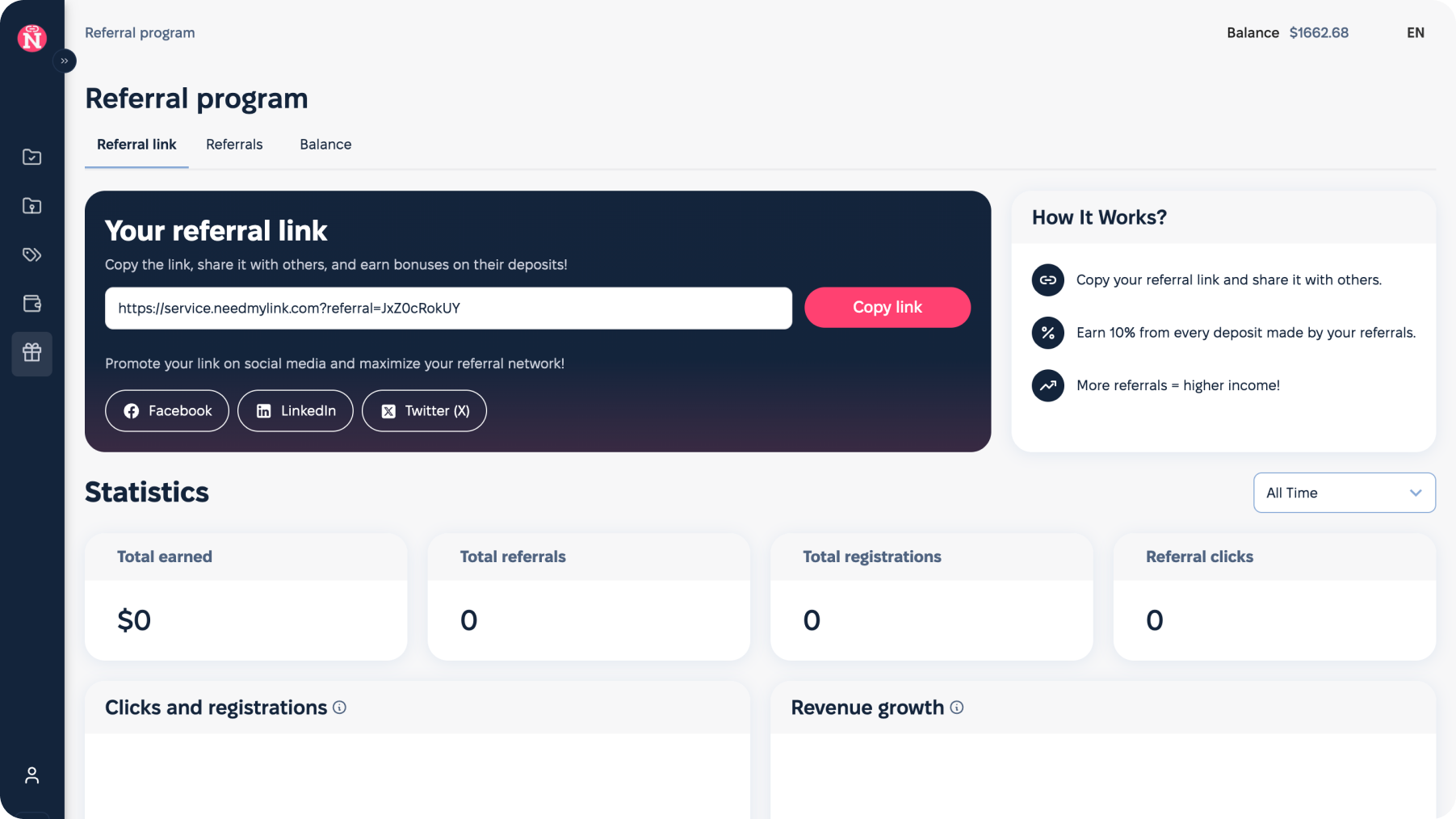 We provide on referral standard the whole range of services from our automatic platform - forum links, outreach guest posting, indexing, copywriting. The main condition - replenishment of the balance on the platform. If your lead needs services that are not in the platform (PBN or complex SEO-promotion) - you can individually inform us, and we will manually charge you % of commission for such a lead.