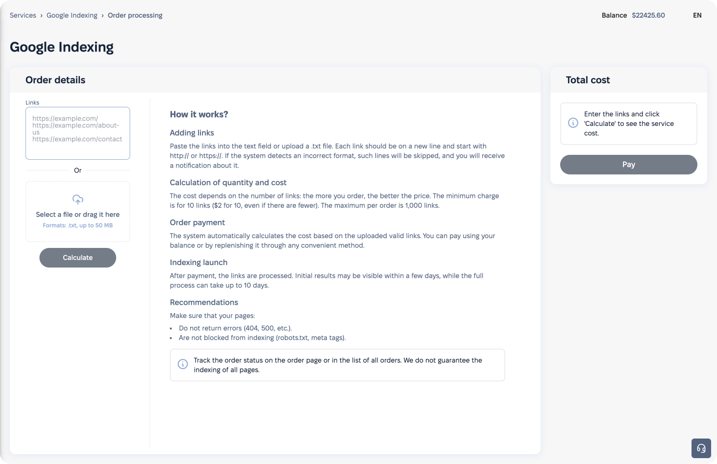 Importante: El lote mínimo de indexación única es de 50 enlaces.