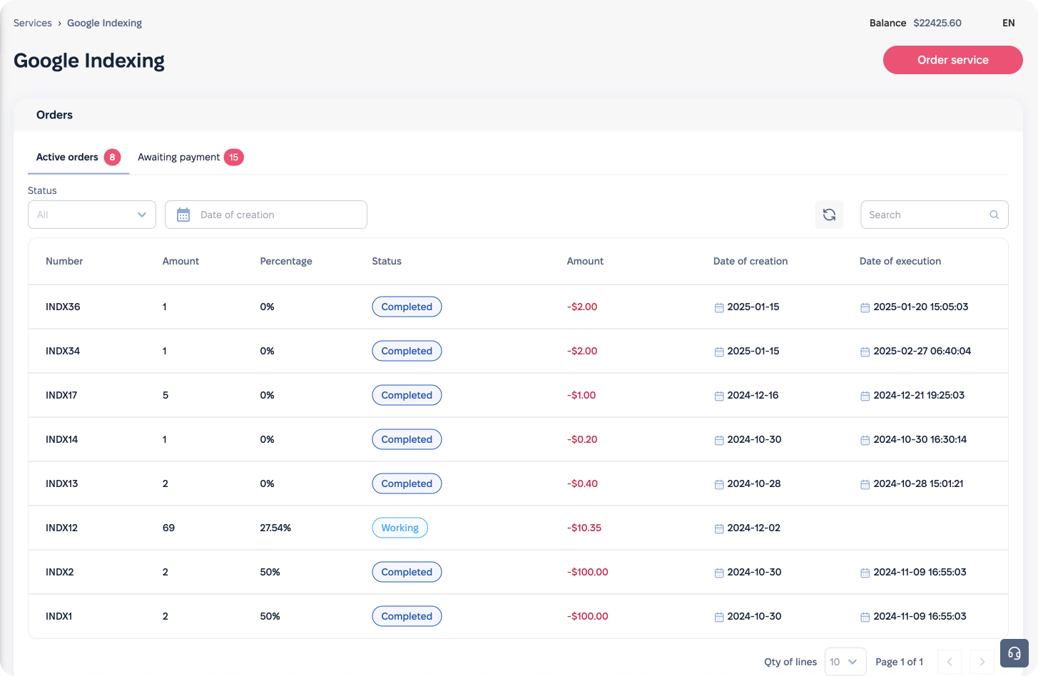 Ofrecemos garantías de indexación web por Google. Si se trata de enlaces de baja calidad, no podemos garantizar el resultado, pero por término medio, es del 50%+. Para los enlaces de alta calidad de foros o perfiles, la tasa de indexación es del 70-80% o superior. Si se trata de enlaces de alta calidad (publicaciones de divulgación, PBN, páginas principales de un sitio web), la tasa de indexación será lo más alta posible, hasta el 100%.