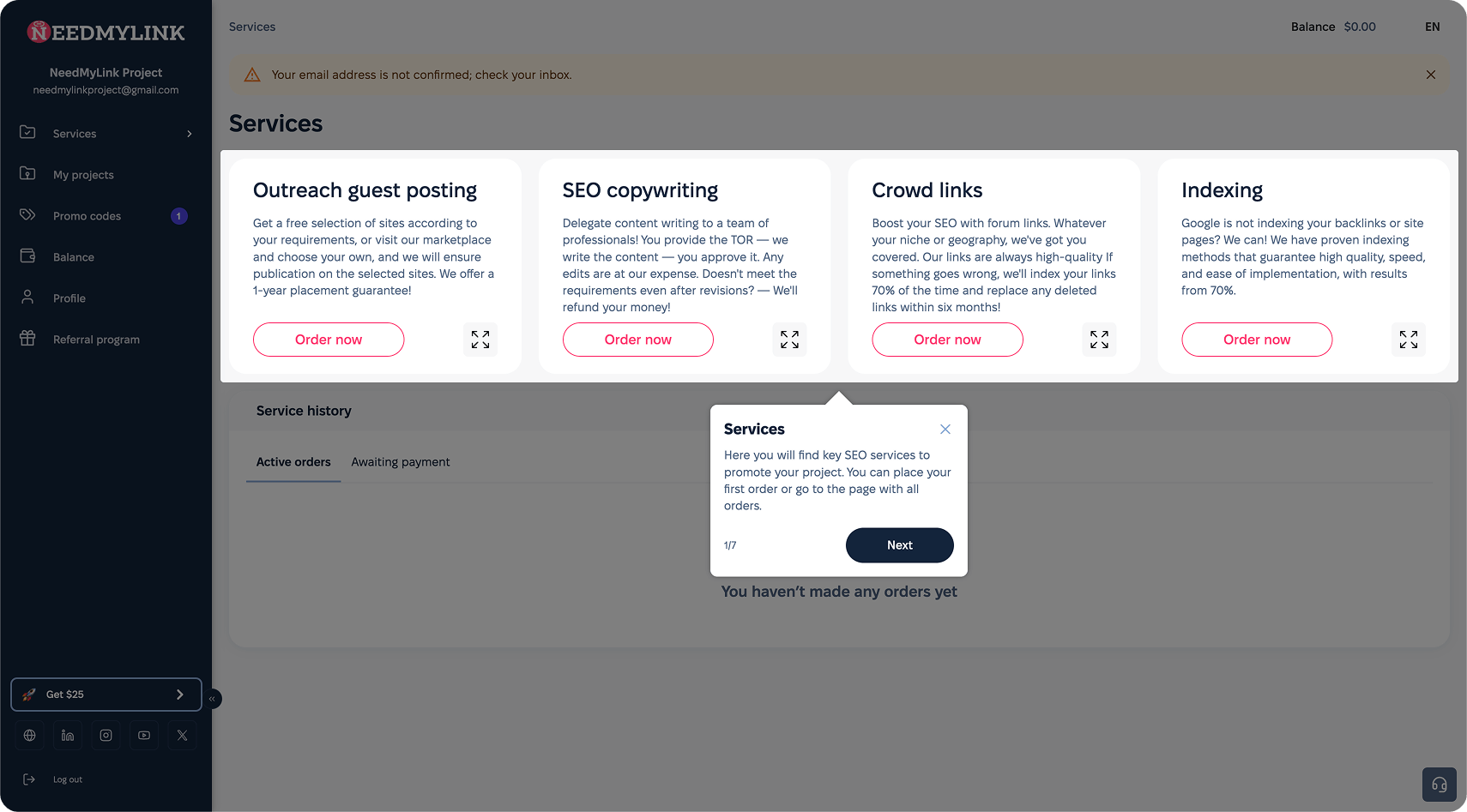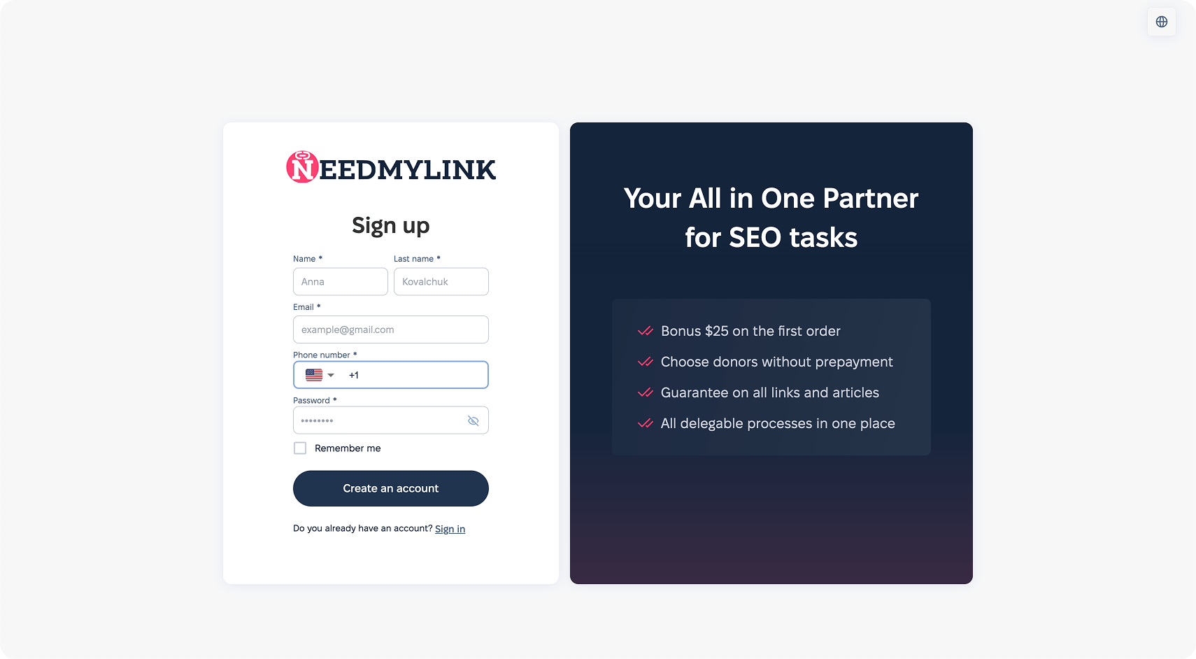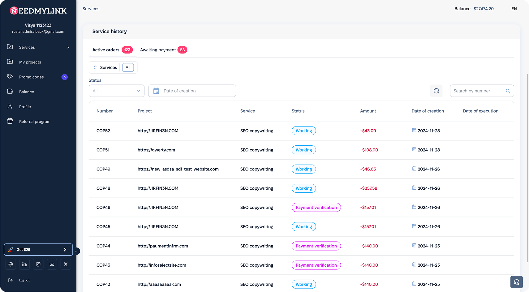 Nuestra plataforma es una solución SEO todo en uno única. Un panel de control fácil de usar en el que podrá gestionar fácilmente todos los procesos delegados: creación de enlaces, redacción SEO, etc. Comodidad, control, análisis, transparencia y servicios de alta calidad, todo en un mismo lugar. Bonificaciones regulares, promociones, códigos de descuento, regalos exclusivos y participación en nuestro programa de fidelidad.