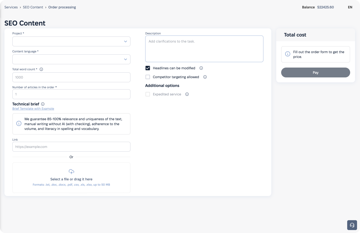 Podemos reescribir el contenido gratuitamente si no se ha redactado de acuerdo con los términos previamente acordados. Le recomendamos encarecidamente que nos proporcione un briefing de alta calidad para que nuestro equipo pueda comprender plenamente sus necesidades. Esto evitará revisiones una vez terminado el trabajo y ahorrará tiempo a ambas partes. Si decide encargar escritura SEO con nuestra consultoría de SEO copywriting y necesita ayuda para crear un briefing, puede solicitar un servicio adicional y nuestro especialista en SEO creará el mejor briefing para los redactores.