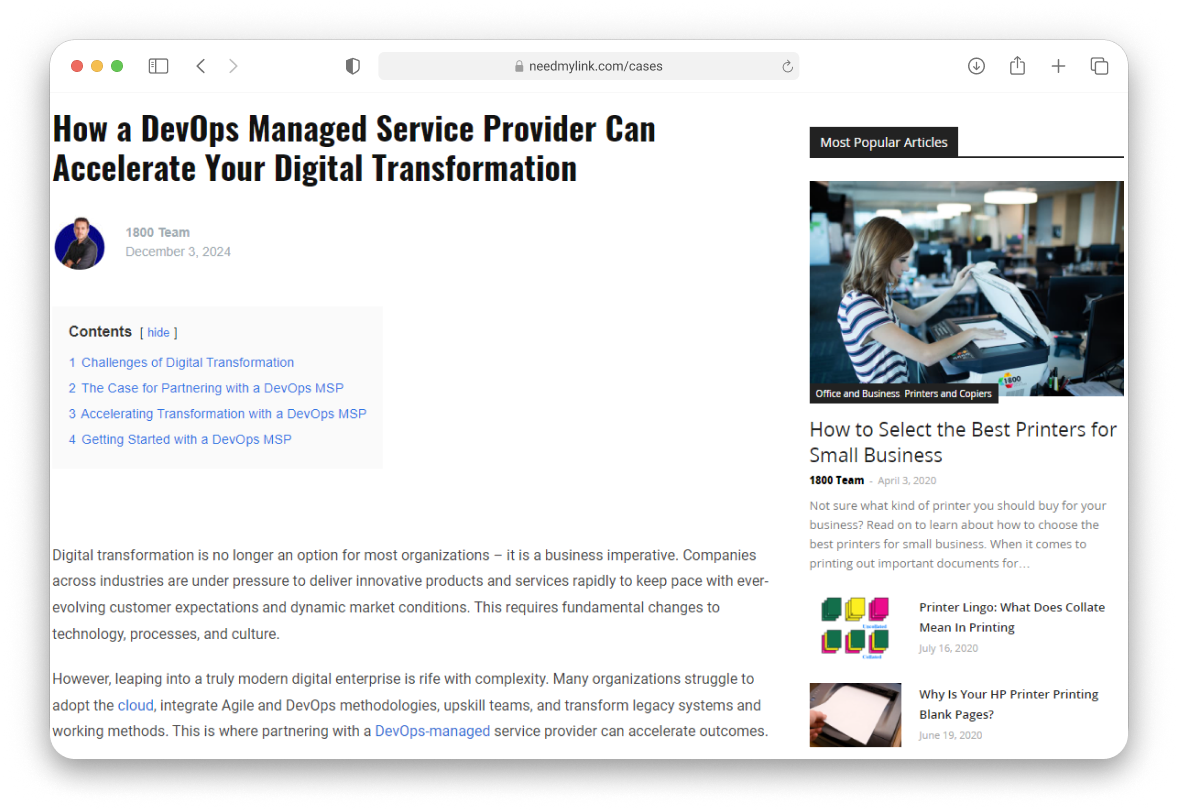 Now let’s take a look at how we worked on all these aspects. In the first screenshot, there’s an article on a well-known portal with more than 10,000 traffic and DR 43. The article discusses real examples of how DevOps companies help online services improve. This topic and the donor site perfectly match our client’s niche, and Google highly values these types of links.