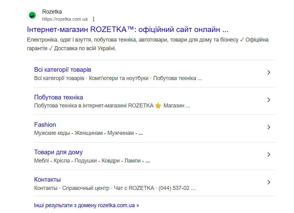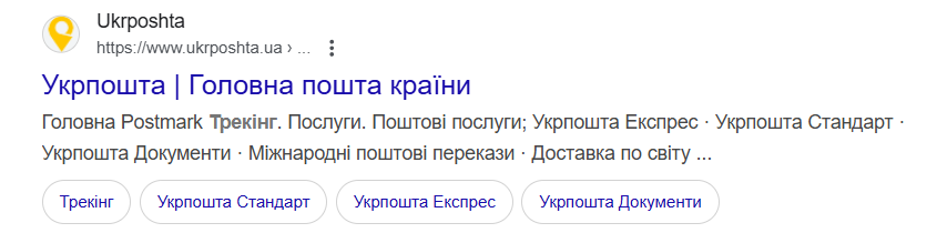 Быстрые ссылки – это дополнительные навигационные элементы, которые появляются под основным снипетом. Обычно они ведут на популярные разделы сайта. У интернет-магазина Rozetka это, например: «Все категории товаров», «Бытовая техника», «Контакты». Появление быстрых ссылок зависит от архитектуры сайта, правильной иерархии заголовков и чёткой внутренней структуры. Еще один пример – сниппет Укрпочты, где есть быстрые ссылки на разделы «Трекинг», «Укрпочта Стандарт», «Укрпочта Экспресс», «Укрпочта Документы» :
