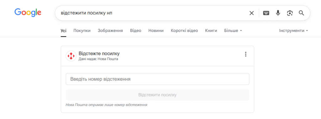 Иногда в сниппете можно увидеть строку поиска – прямо в результатах Google. Это редкий, но полезный элемент, позволяющий пользователю ввести дополнительный запрос и искать внутри сайта, не заходя на него. Чтобы он появился, нужно настроить внутренний поиск и указать его URL в Schema.org. Например, Новая почта позволяет ввести в строку номер посылки для отслеживания.